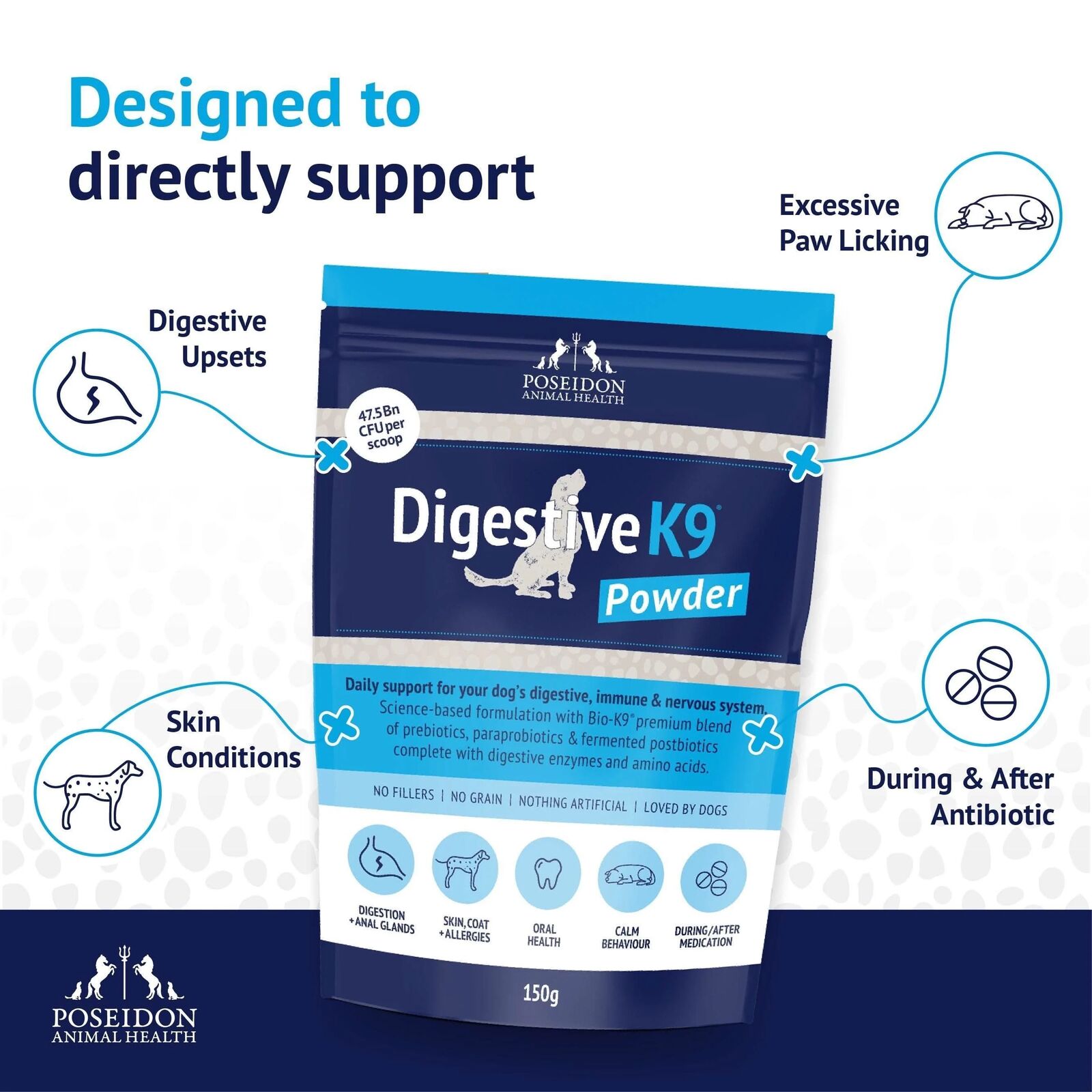 DigestiveK9 is a multi-action daily gut health supplement, designed to support digestion, immunity, skin and nervous system for dogs of all life stages and breeds.